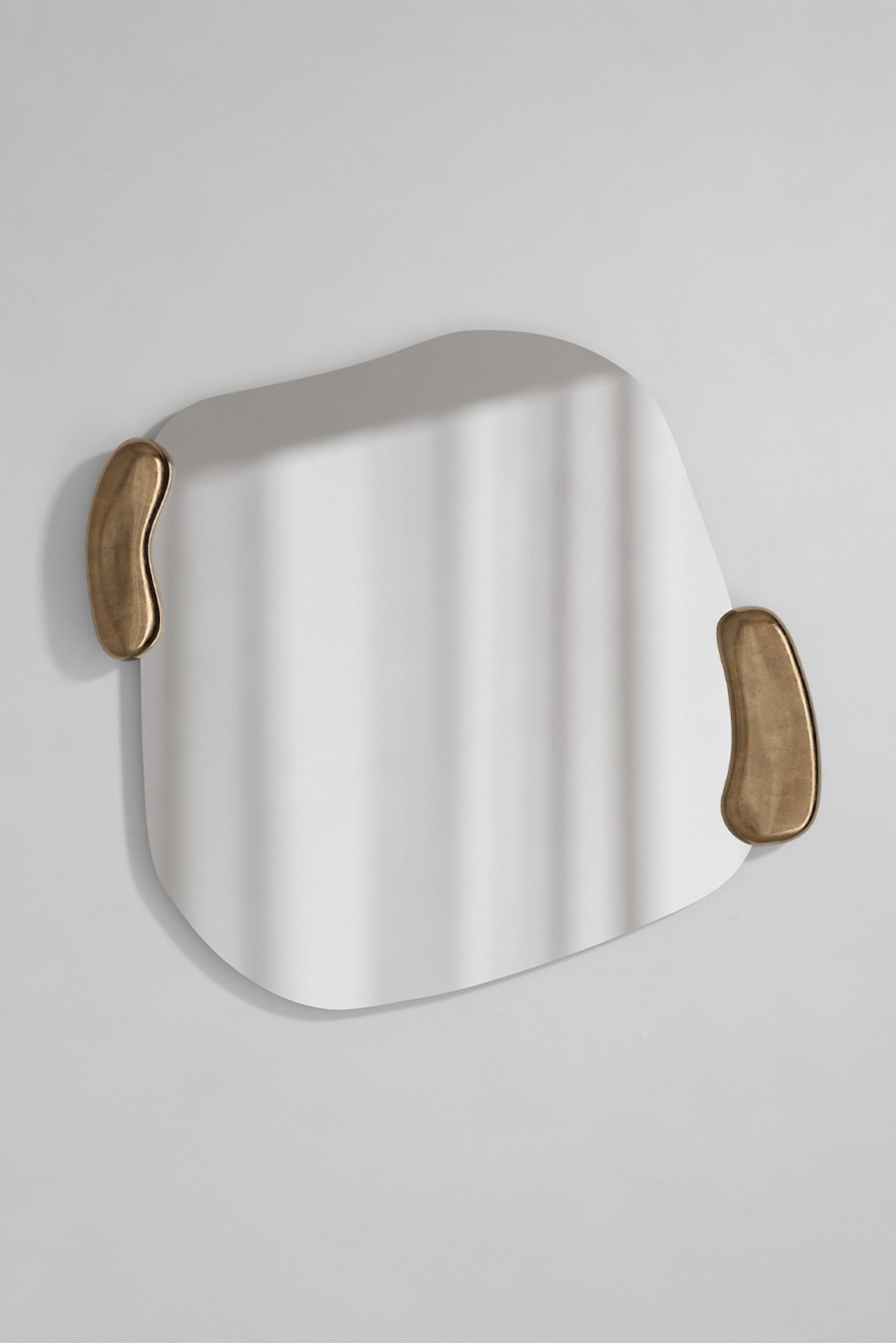 The two sculptures seem to hold the mirror firmly in place, and their lateral position, scale, and shape invite interaction with this CALCO GOLD SQUARE. The contrast between the smooth mirror and the textured surfaces creates a sense of richness, depth, and expressiveness. It invites you to touch and admire the form and textures of the mirror.