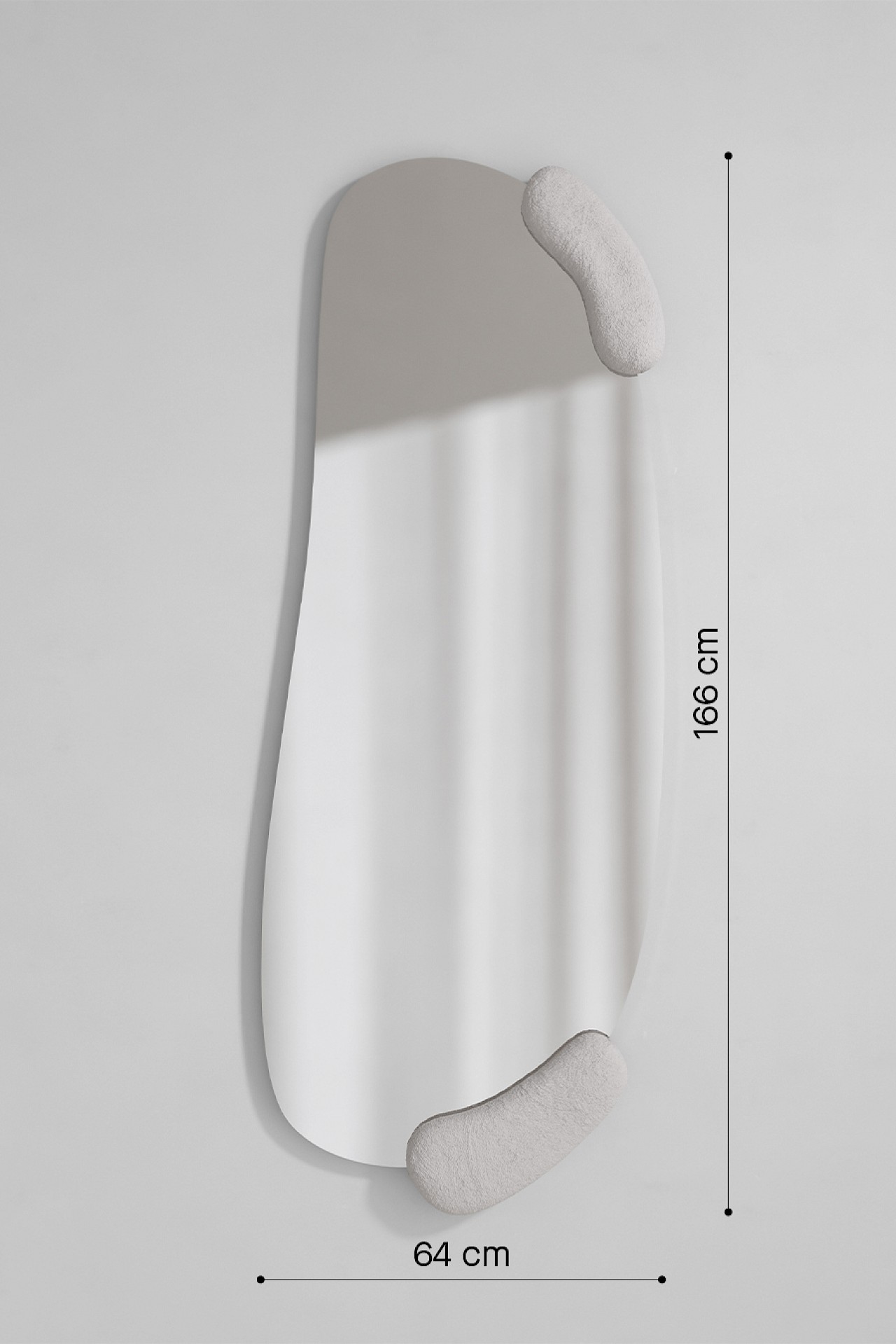 The elegant and sensual white accents appear hand-sculpted, with the detailed brushstrokes showcasing the craftsmanship of our ‘Master Mirror Makers.’ Precision machines, in turn, create the asymmetrical, organically shaped mirror. The two sculptures seem to hold the mirror firmly in place, and their lateral position, scale, and form encourage interaction with this CALCO WHITE HALL.